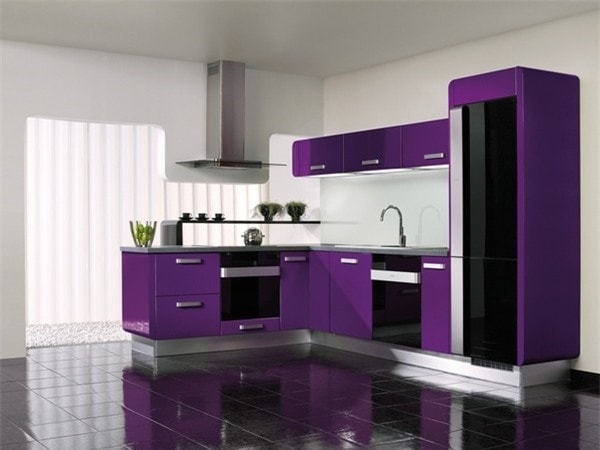 Tủ bếp gỗ kết hợp với tường màu tím