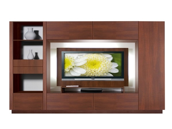 Thiết kế của kệ tivi và hệ giá sách này quả là hoàn hảo cho căn phòng. Với thiết kế giá mở có các khung hộp bằng nhau và một kệ tủ đóng bên dưới, kệ tivi này giúp bạn vừa có thể trang trí mảng tường, mà vẫn cất được vô số các đồ dùng khác trong hệ tủ đóng.