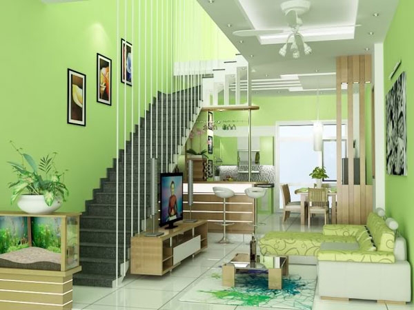 Nên bố trí ánh sáng đèn dịu chiếu từ trần nhà xuống, không để đèn chiếu trực tiếp vào mặt gây kích thích, tạo cảm giác chèn ép, bức bối. Tận dụng không gian chết để bài trí vật dụng nhỏ trong nhà. Ngoài ra, treo một tấm gương lớn trên tường đối diện cửa ra vào, gương sẽ phản chiếu toàn bộ căn phòng tạo cảm giác căn phòng rộng gấp đôi.